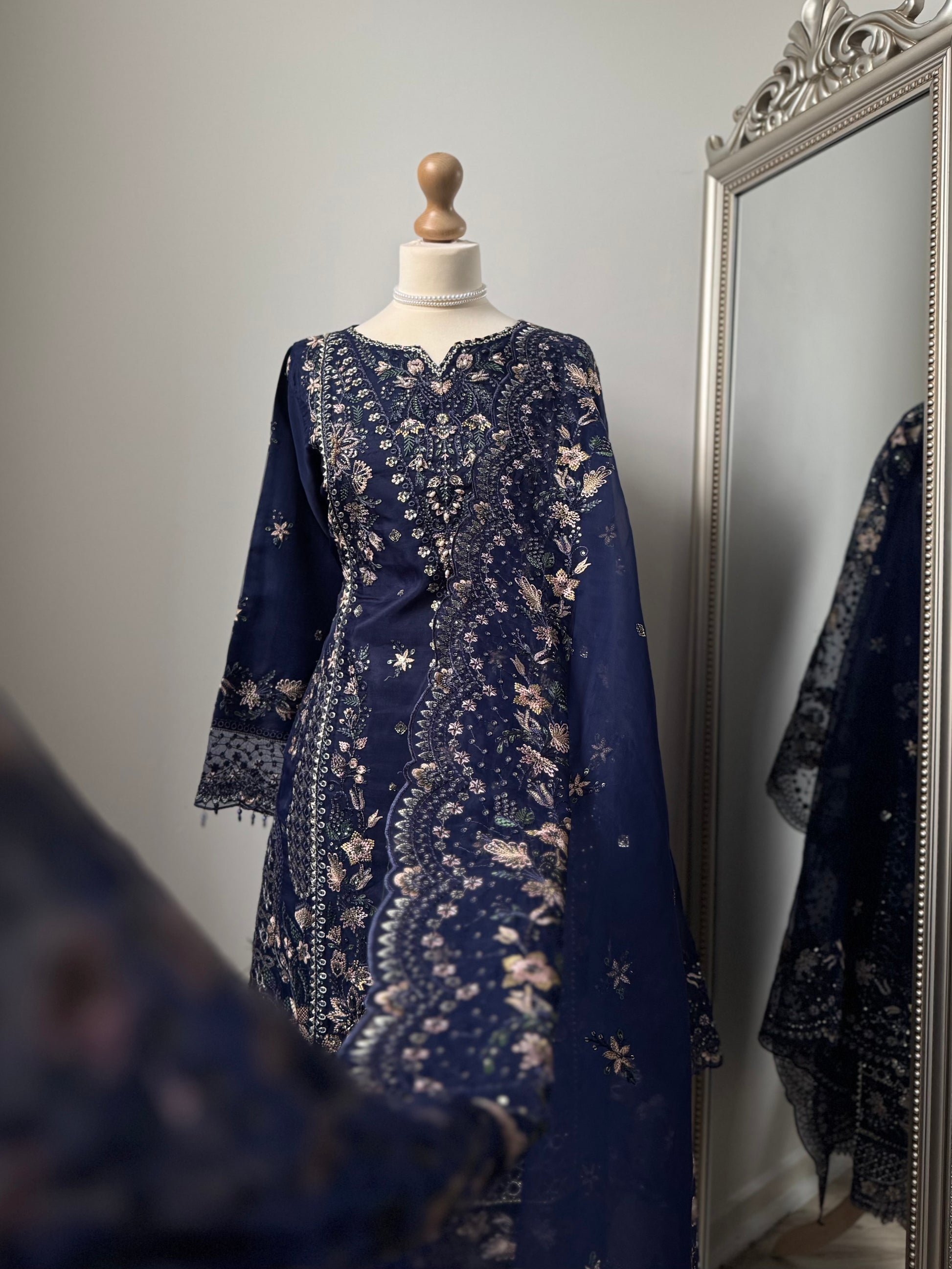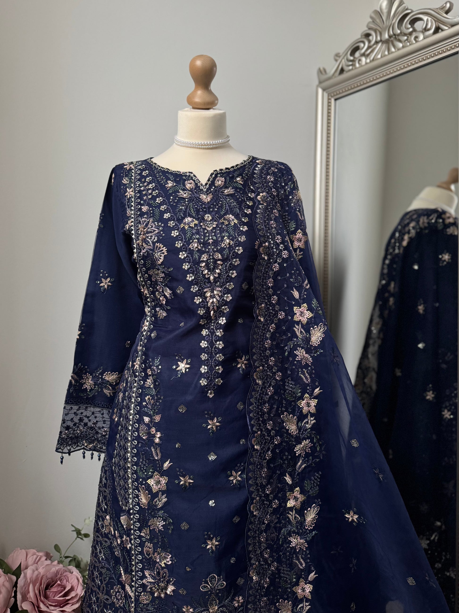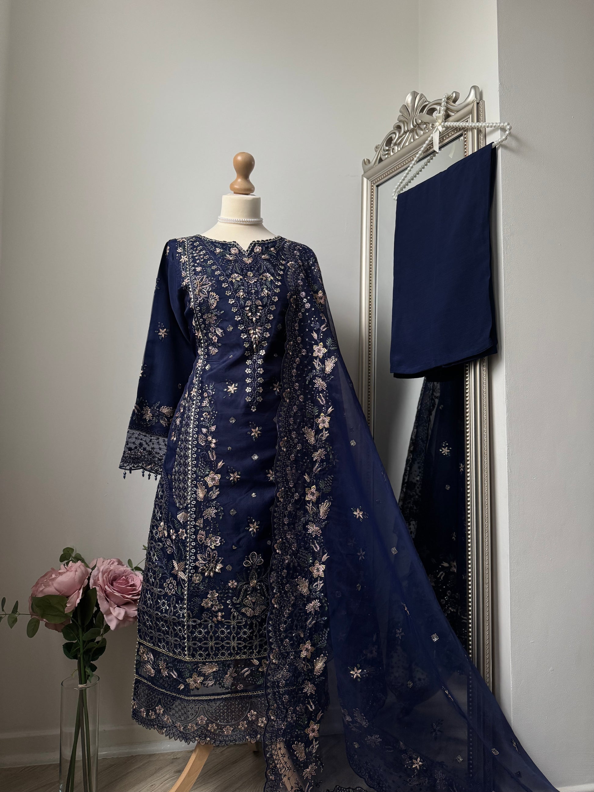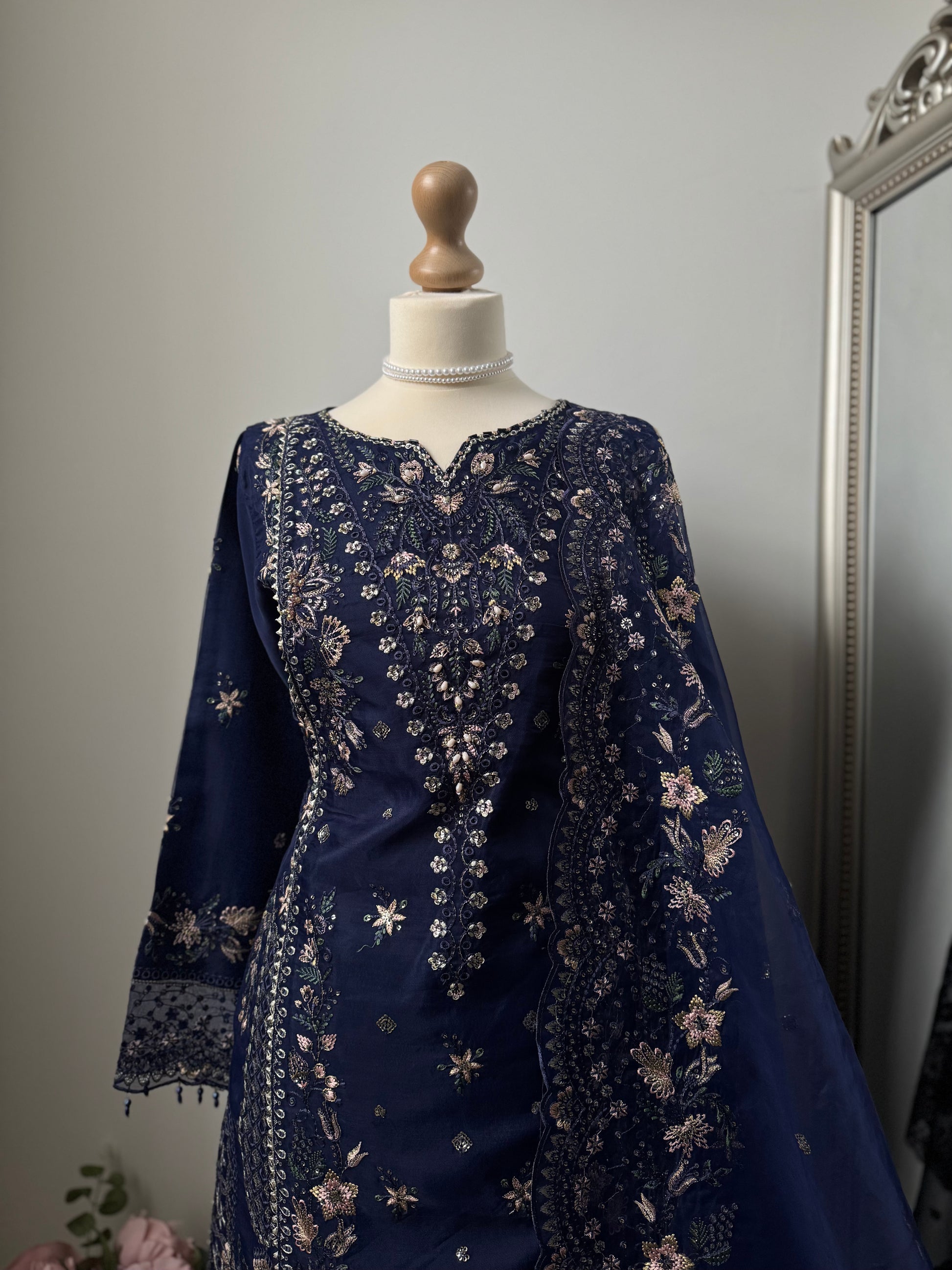 Elevate your festive look with this stunning Navy Blue embroidered kurta set, crafted with elegance and timeless charm. Designed as a loose-fit straight kurta, the top is made from luxurious organza fabric, beautifully adorned with intricate embroidered detailing for a refined, celebratory look. The outfit features a coordinating pair of straight trousers stitched in premium PK raw silk, offering structure and comfort for all-season wear.