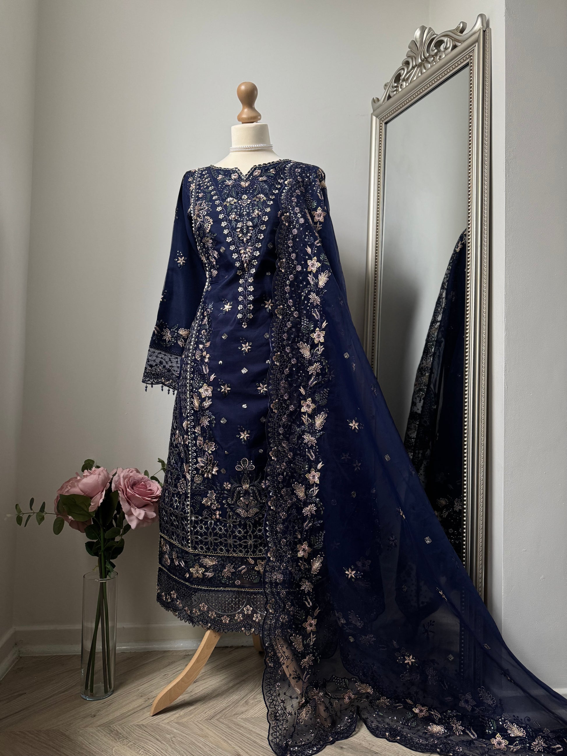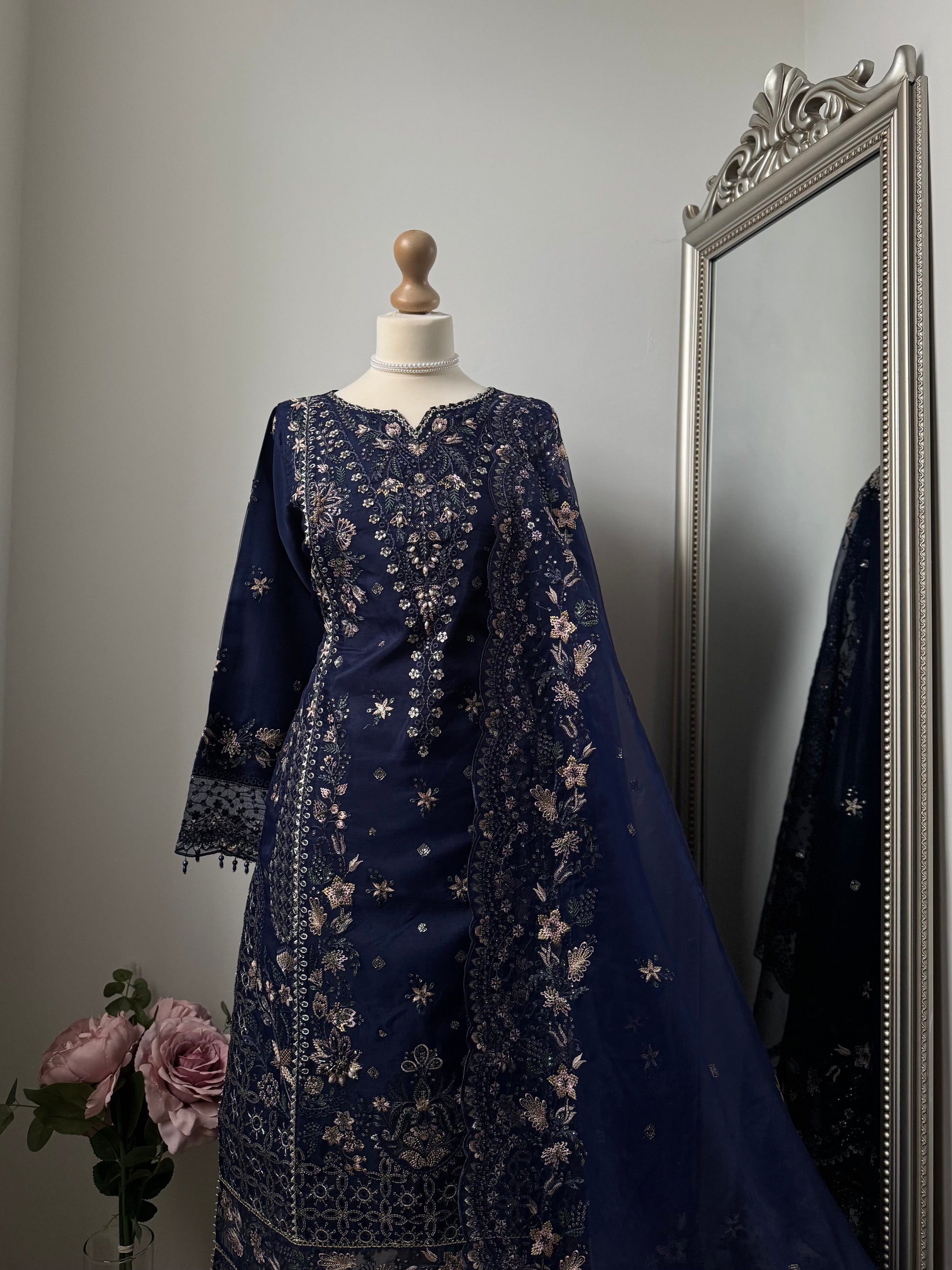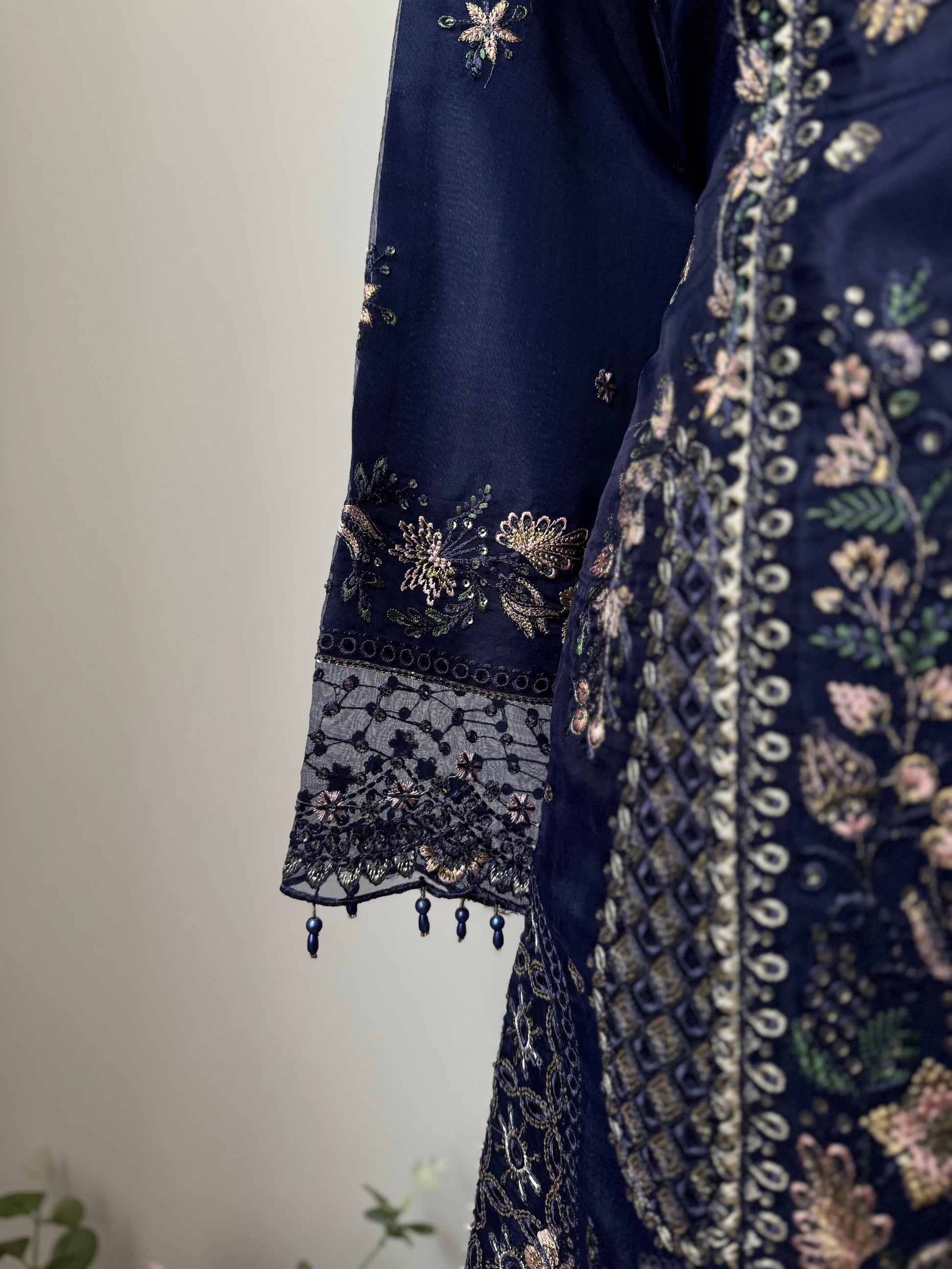 Elevate your festive look with this stunning Navy Blue embroidered kurta set, crafted with elegance and timeless charm. Designed as a loose-fit straight kurta, the top is made from luxurious organza fabric, beautifully adorned with intricate embroidered detailing for a refined, celebratory look. The outfit features a coordinating pair of straight trousers stitched in premium PK raw silk, offering structure and comfort for all-season wear.