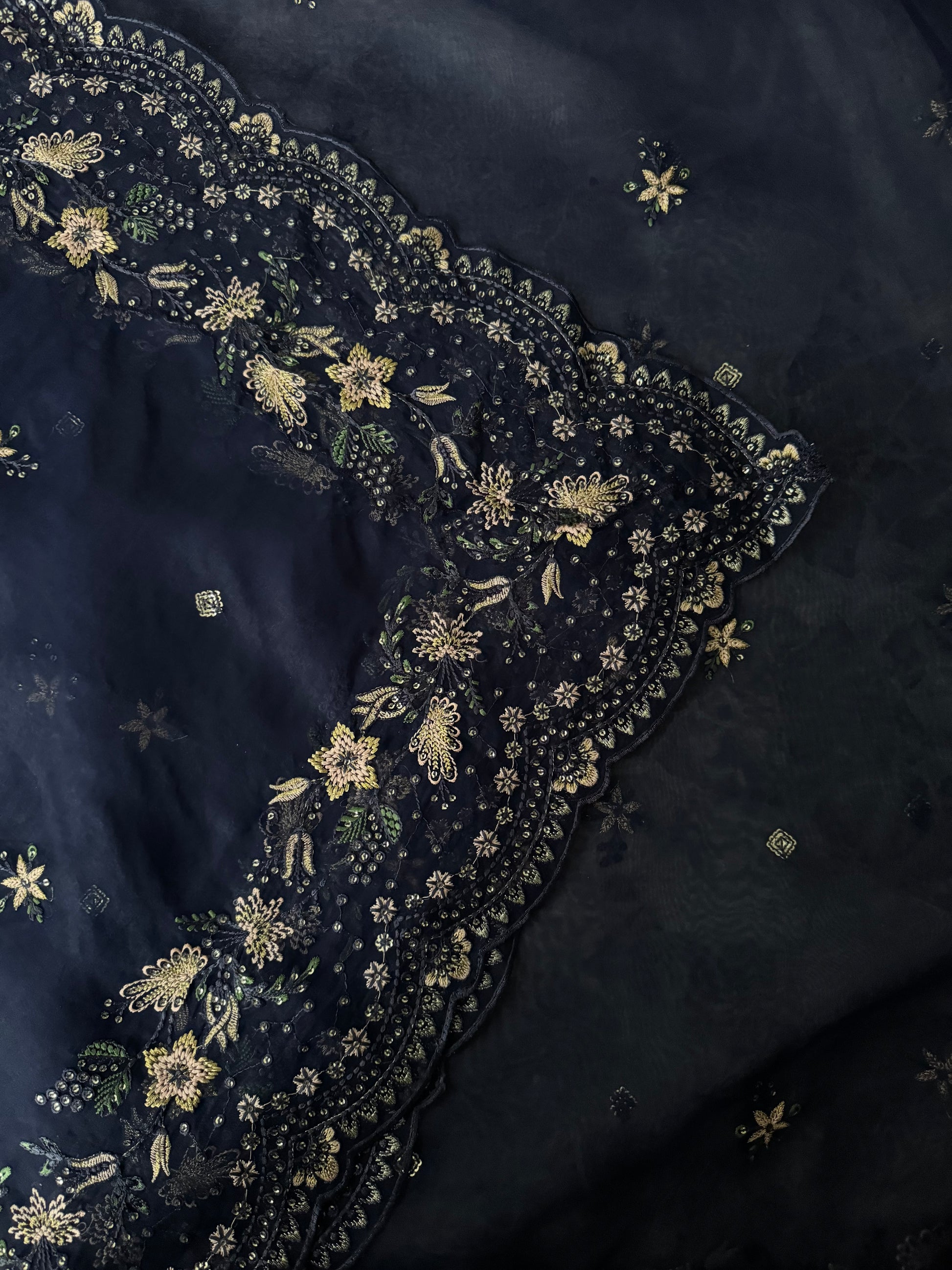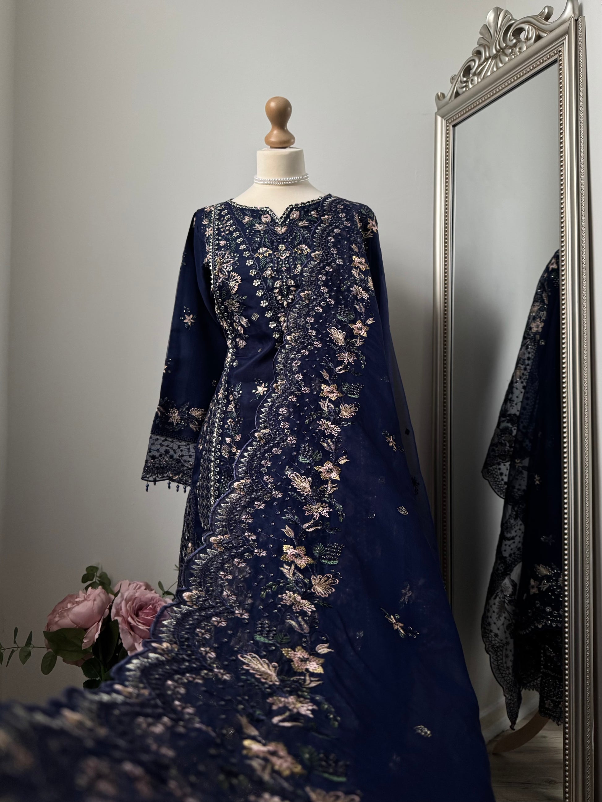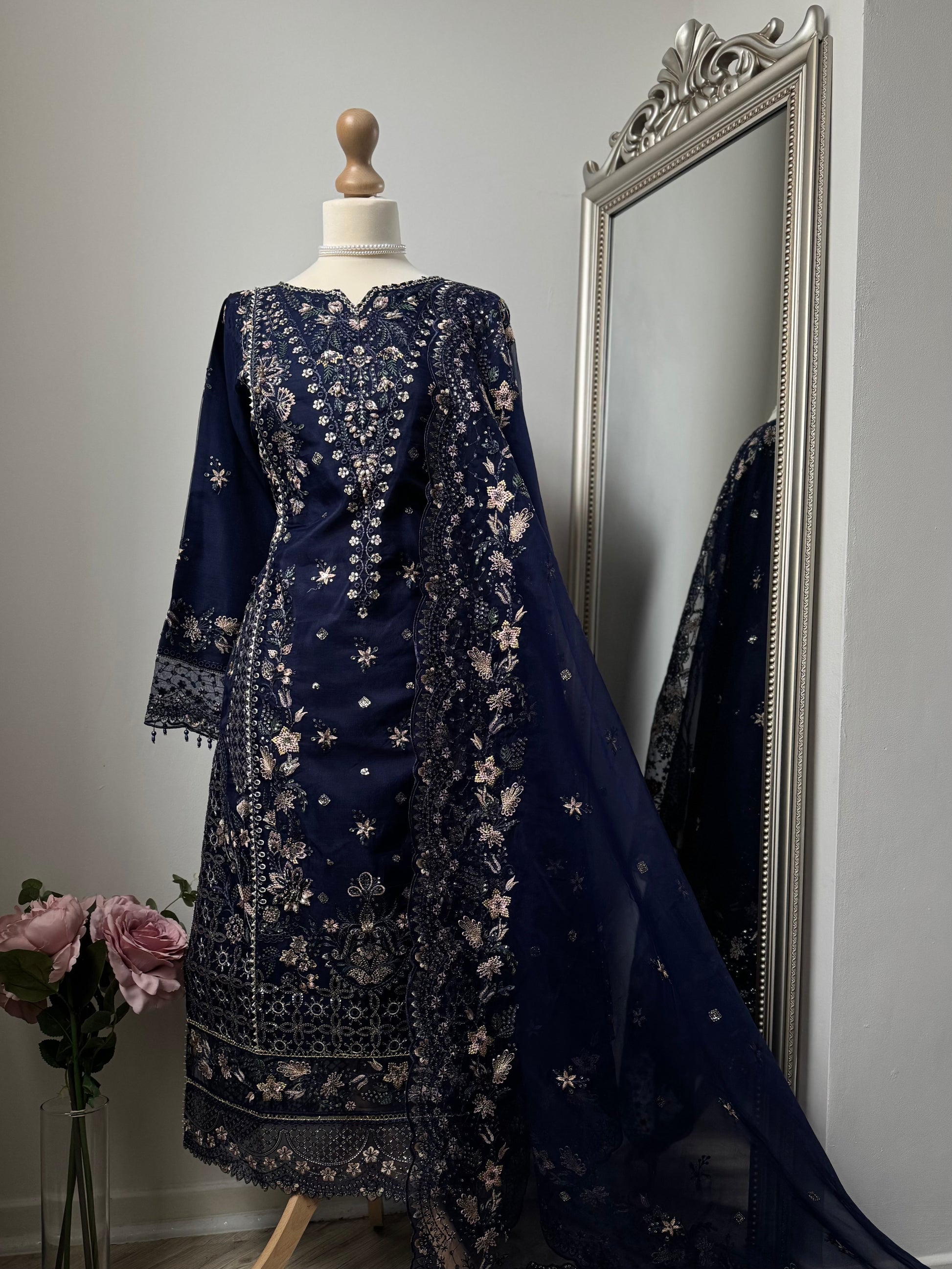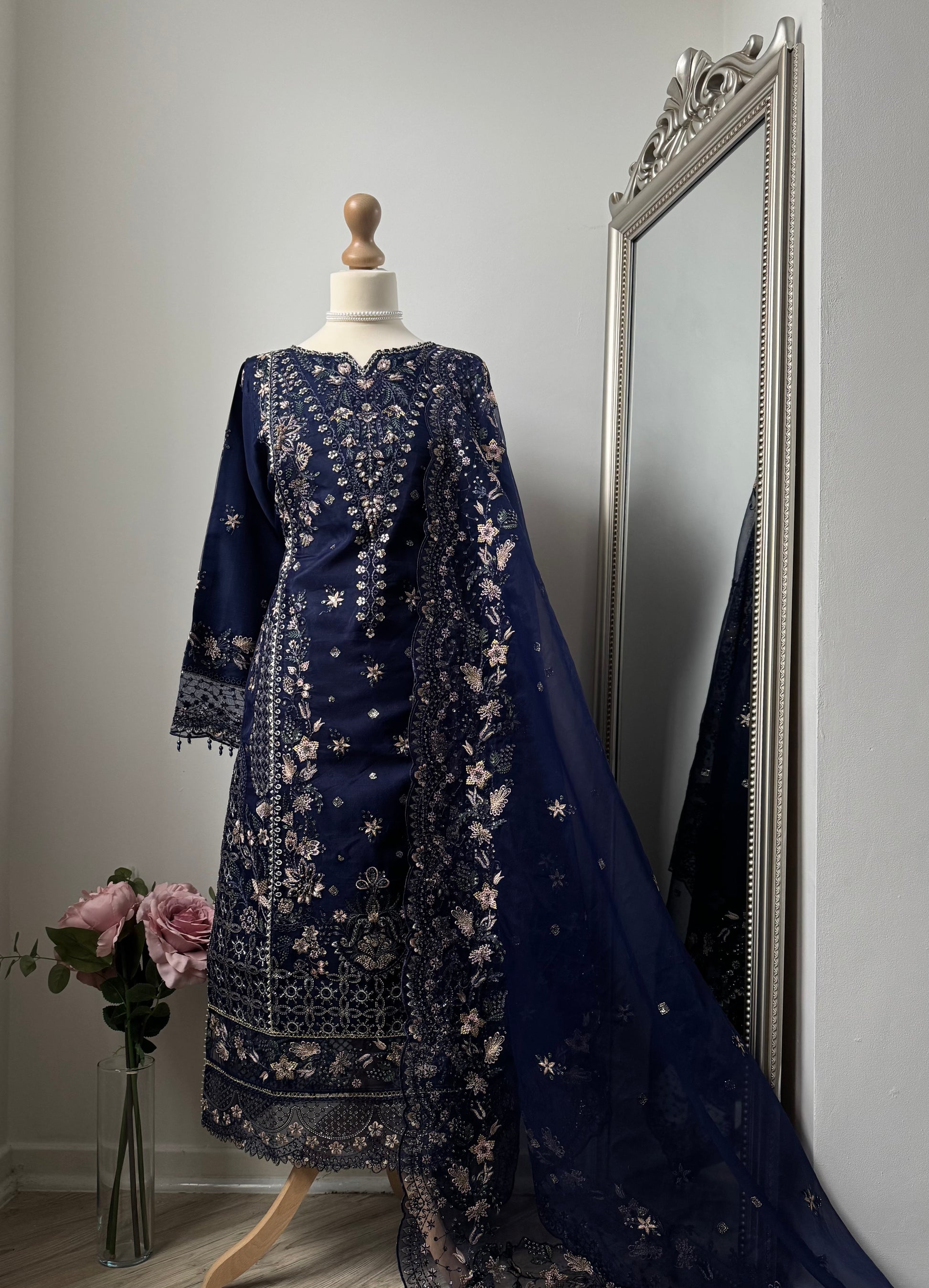 Elevate your festive look with this stunning Navy Blue embroidered kurta set, crafted with elegance and timeless charm. Designed as a loose-fit straight kurta, the top is made from luxurious organza fabric, beautifully adorned with intricate embroidered detailing for a refined, celebratory look. The outfit features a coordinating pair of straight trousers stitched in premium PK raw silk, offering structure and comfort for all-season wear.